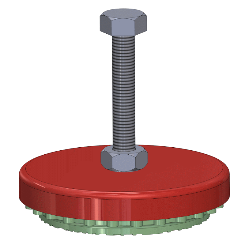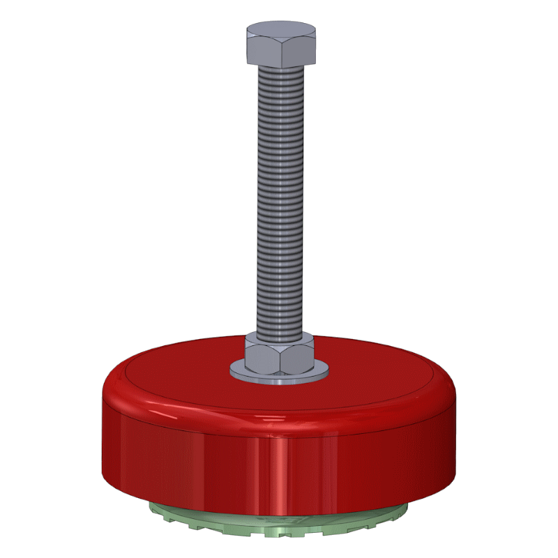 Dynemech Screw Support Mounts series DLK-LP are simple and effective vibration dampers for machines with respective holes in the base. These mounts offer both low frequency attenuation and stable machine levelling. The DLK-LP Series has a lower height for fast and easy installation of machines. DLK-LP Series anti vibrations mounts have low carbon steel body and are used for machines having mounting holes in the base. This levelling mount has a cover plate and dimpled bottom plate holding the insulation plate. Levelling is done by tightening the bolt which lifts the cover plate with the machine base.