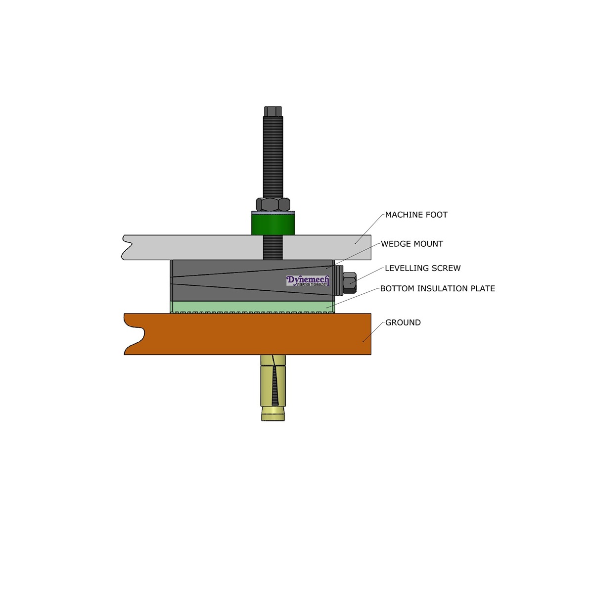 Dynemech Wedge mounts, Series DT are designed for machine tools that are top heavy or have eccentric motion or for machines which must be anchored to the groundreqquire precision levelling, vibration reduction, and/or need to be firmly mounted with the isolator.