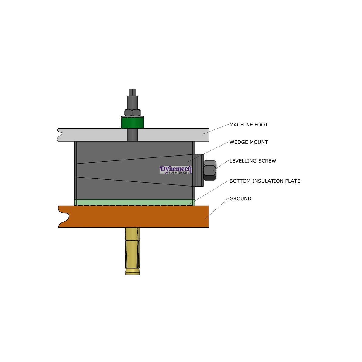 Dynemech Wedge mounts, Series DTHO mounts are sturdy in construction. Designed for machines with high axial dynamic forces and must be anchored to the ground. High levelling adjustment avoids the need of extra shims for installations on steep slope surfaces. DTPH has a height of 150mm to meet TPM requirements. Respective insulation plates are assembled to meet various applications.